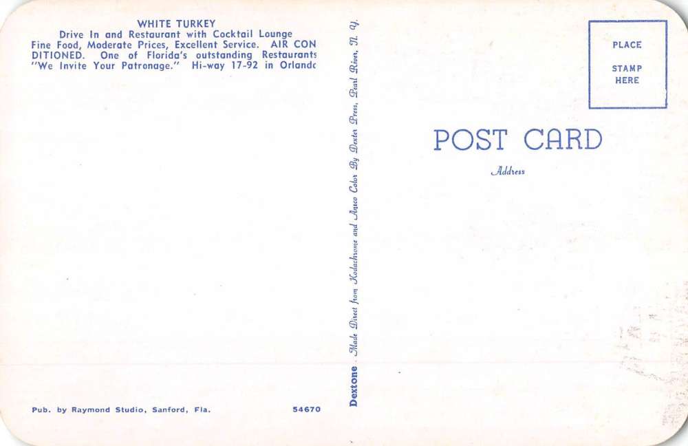 Orlando Florida White Turkey Drive In Street View Vintage Postcard K64397