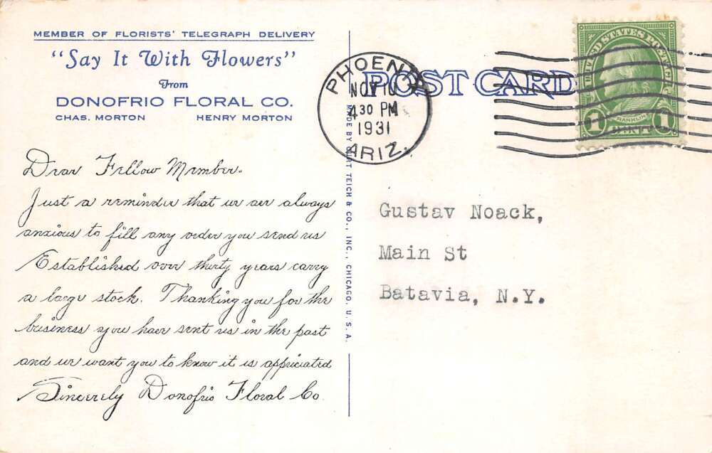 Phoenix Arizona Donofiro Floral Co Florist Flower Shop Vintage Postcard AA77880