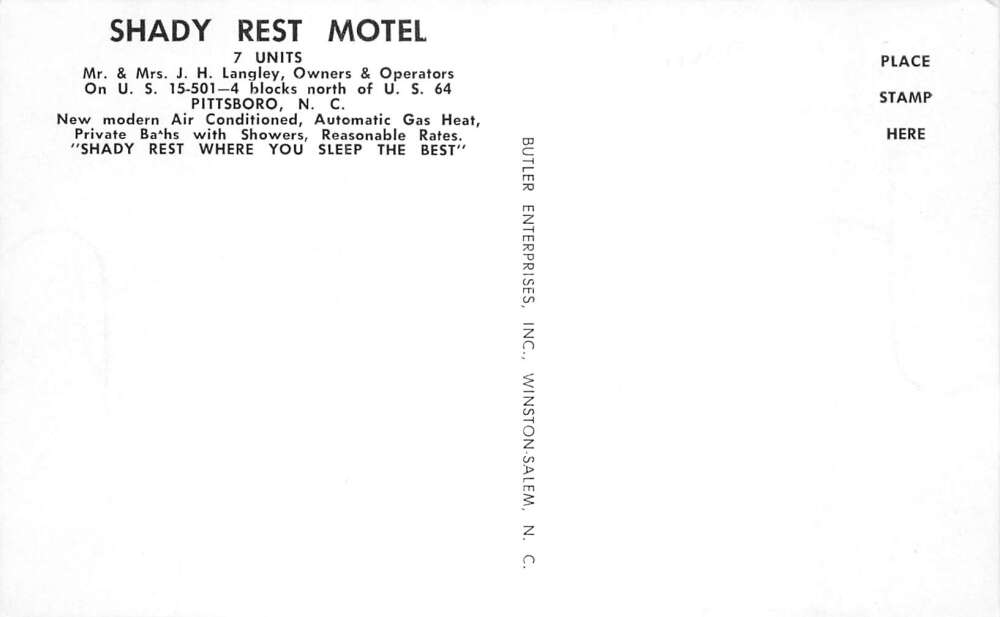 Pittsboro North Carolina Shady Rest Motel Vintage Postcard AA72018