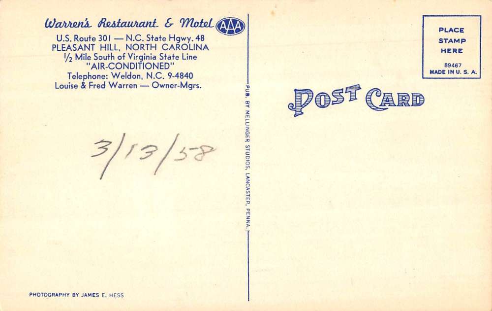 Pleasant Hill North Carolina Warrens Restaurant Antique Postcard K78688