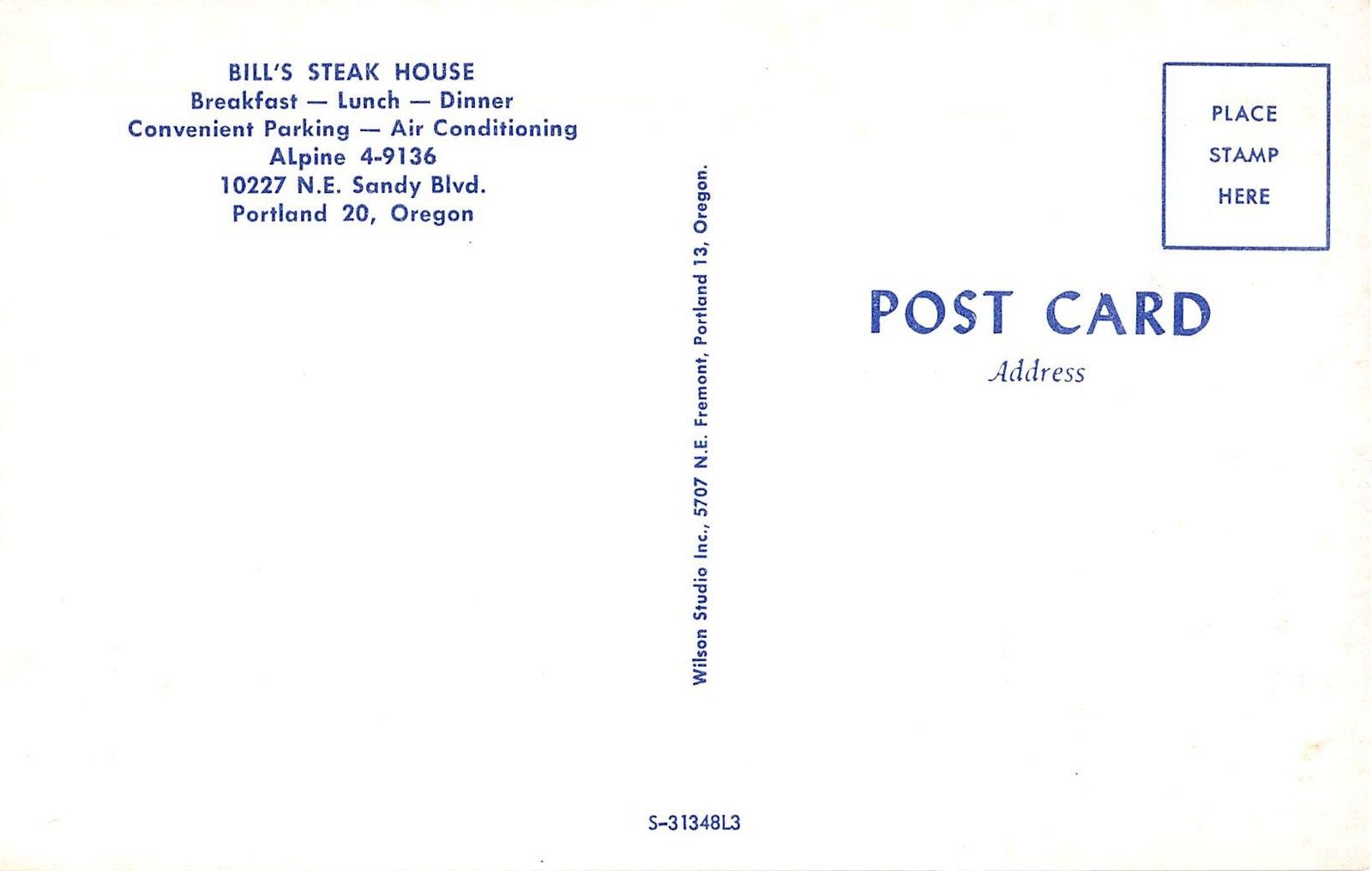 Portland Oregon Bills Steak House Restaurant Vintage Postcard (J6639)