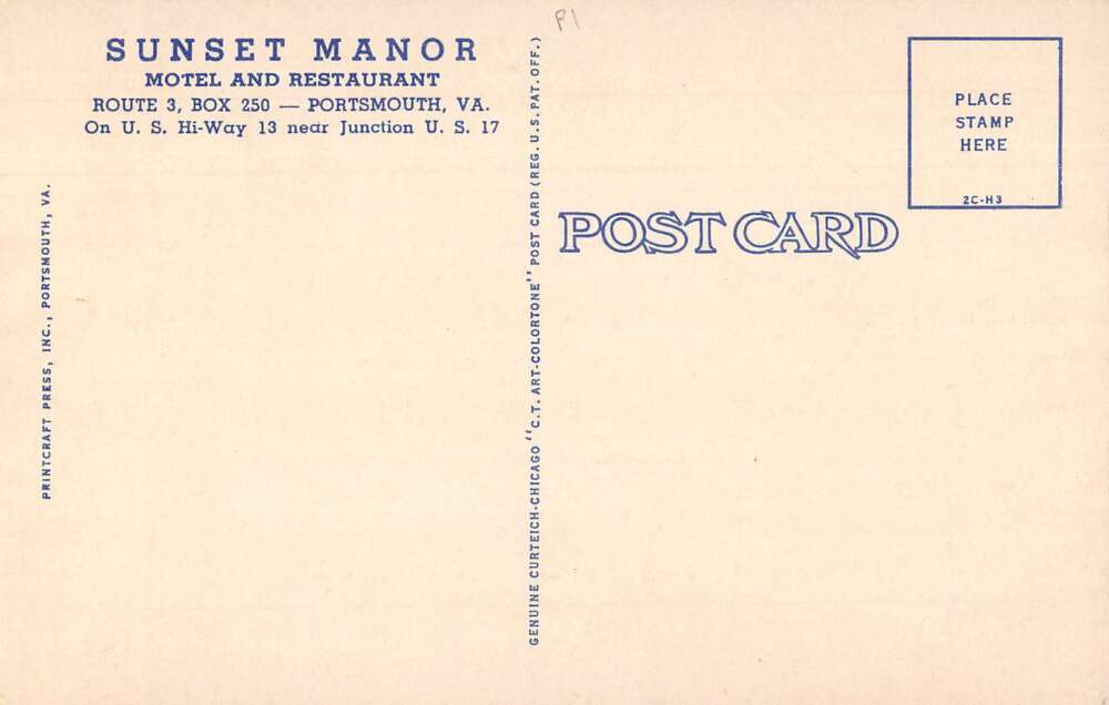 Portsmouth Virginia Sunset Manor Motel and Restaurant Vintage Postcard AA56418