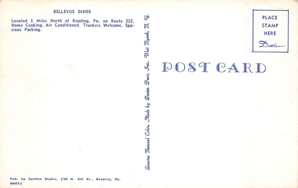Reading Pennsylvania Bellevue Diner, Photochrome Vintage Postcard U11659