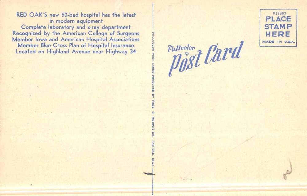 Red Oak Iowa Murphy Memorial Hospital Street View Antique Postcard K47048