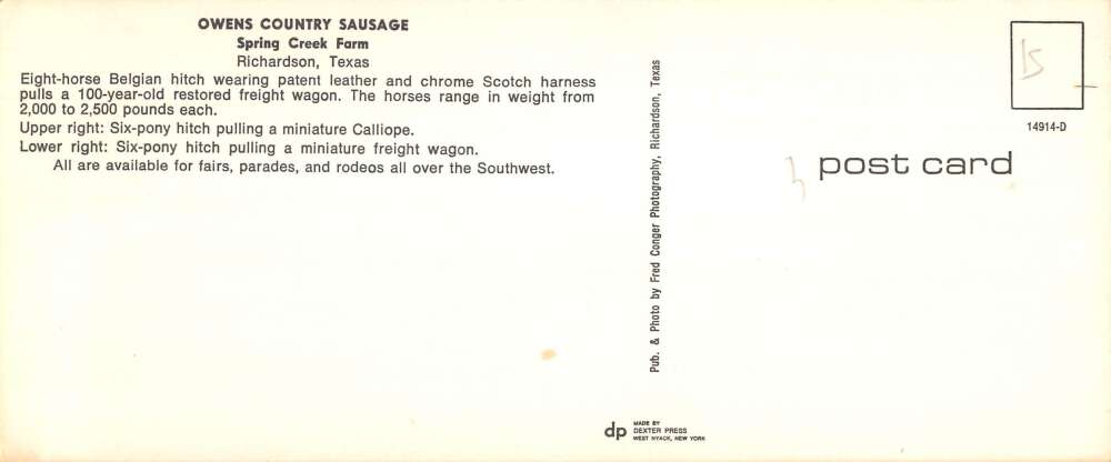 Richardson Texas Spring Creek Farm Horse Team Extra Wide Postcard AA85549