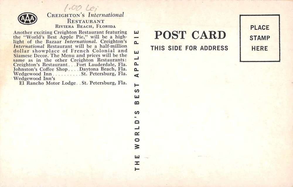 Riviera Beach Florida Crighton’s International Restaurant vintage pc Z50987