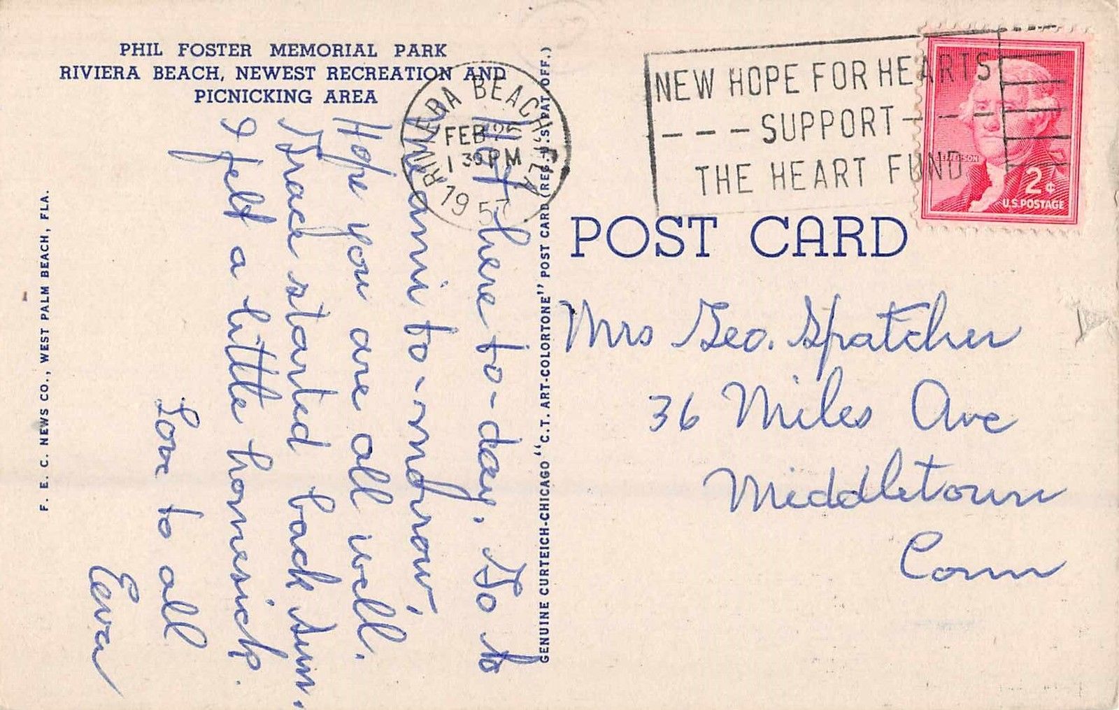 Riviera Beach Florida Phil Foster Memorial Park linen antique pc (Z9141). Good condition – has been used.