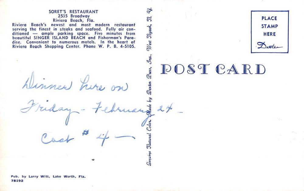 Riviera Beach Florida Sorets Restaurant Street View Vintage Postcard K71272