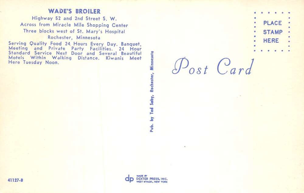 Rochester Minnesota Wade’s Broiler Restaurant Interior View Postcard AA98305