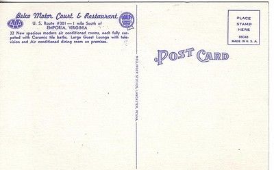 S725 Belco Motor & Court Restaurant. Emporia, VA. Good Condition. Early Era.