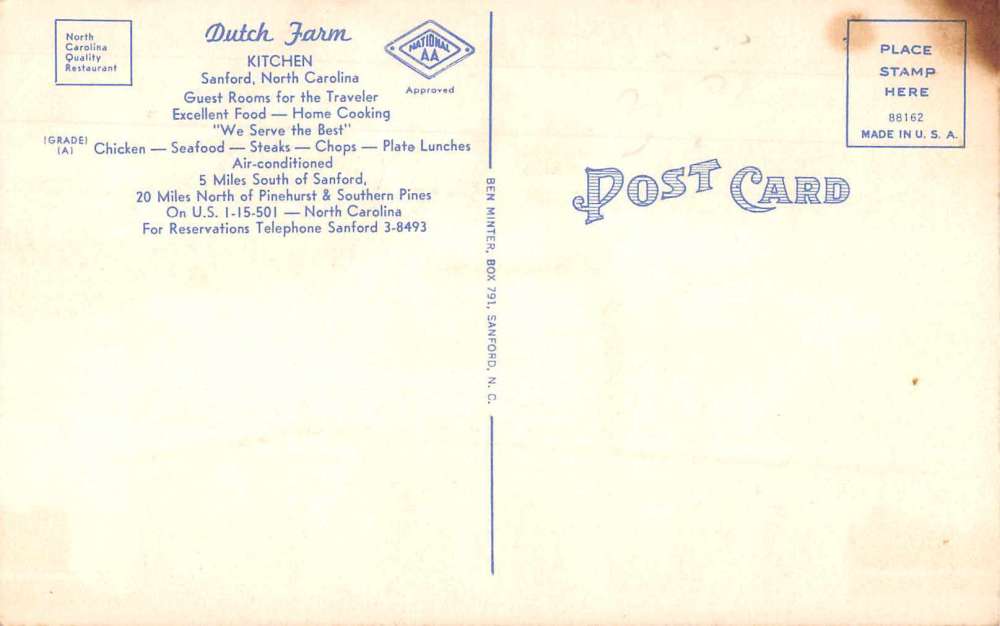 Sanford North Carolina Dutch Farm Kitchen Restaurant Vintage Postcard JI658078