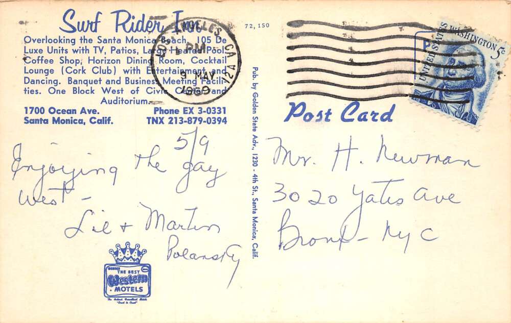 Santa Monica California Surf Rider Inn Vintage Postcard AA111320