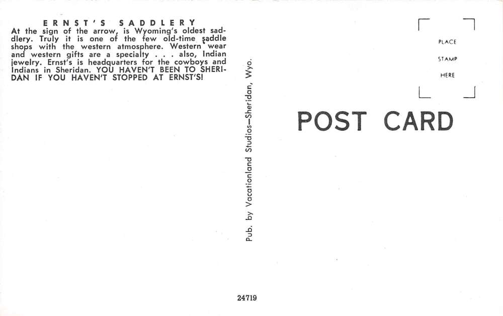 Sheridan Wyoming Ernst’s Saddlery Western Wear, Chrome, Vintage Postcard U16669