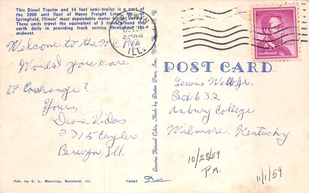 Springfield Illinois Diesel Tractor Hayes Freight Lines Postcard AA79973