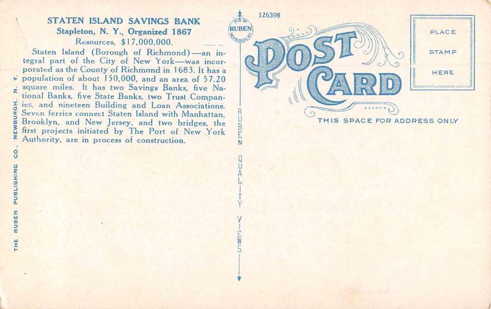 Stapleton New York Staten Island Savings Bank Antique Postcard J69692