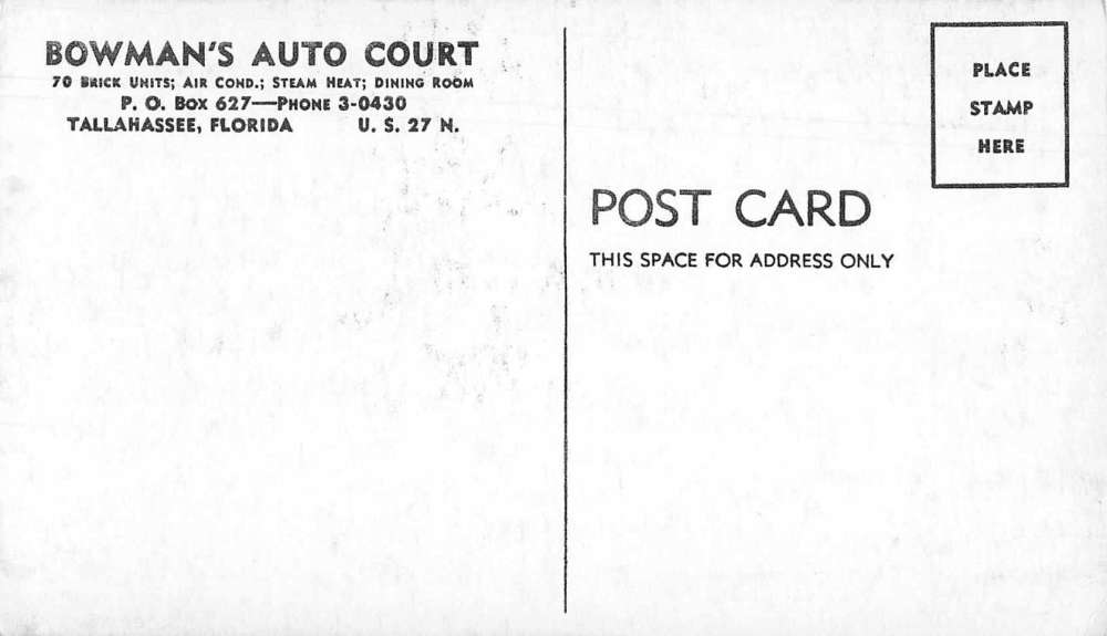 Tallahassee Florida Bowman’s Auto Court Vintage Postcard JJ658967