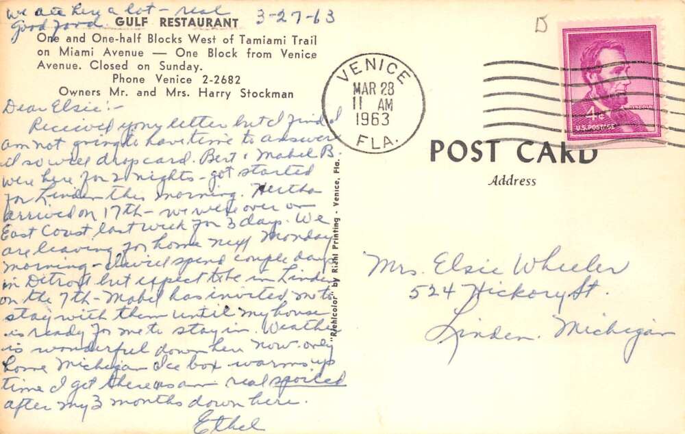 Venice Florida Gulf Restaurant Vintage Postcard AA74657
