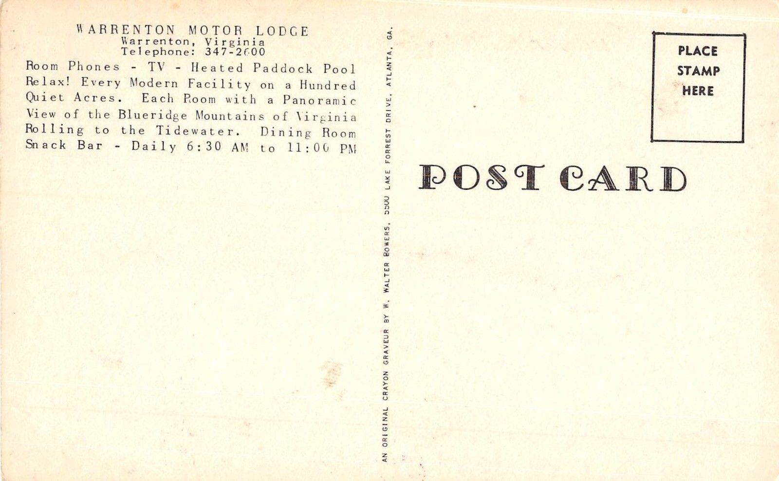 Warrenton Motor Lodge Virginia Antique Postcard (J5986) Good Condition.