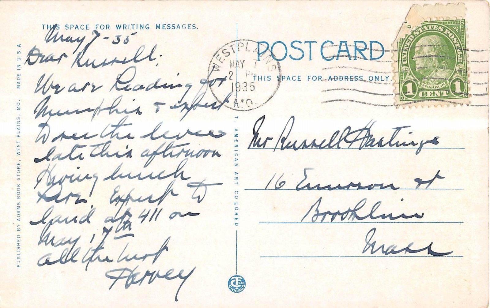 West Plains Missouri Commercial Hotel General View Antique PC V8741. Okay condition.