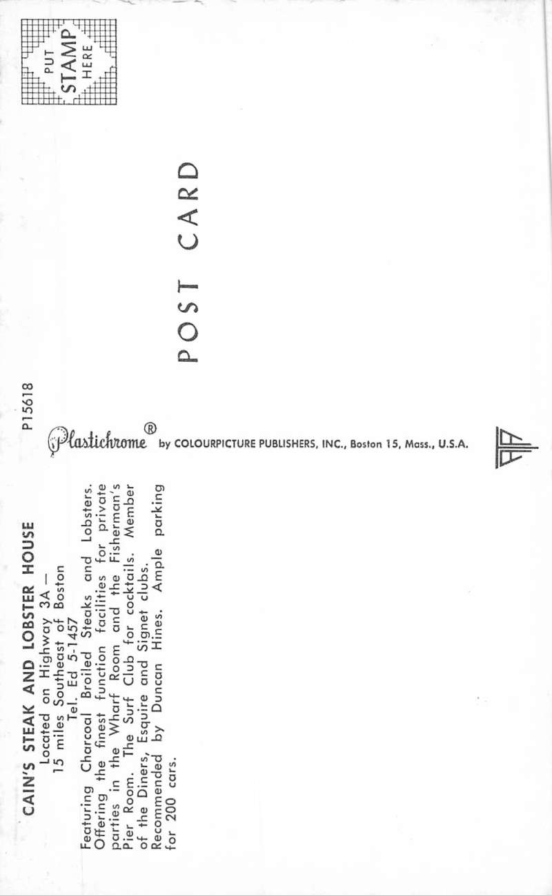 Weymouth Massachusetts Cain’s Steak and Lobster House vintage pc ZC548715