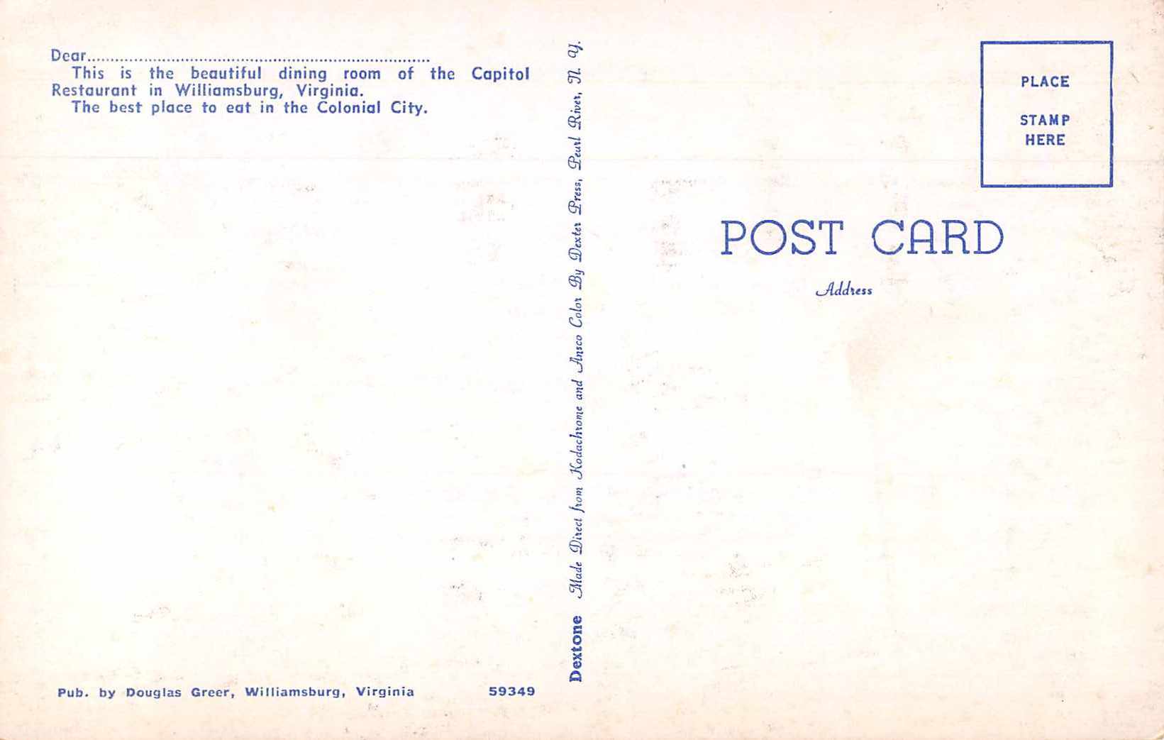 Williamsburg Virginia Capitol Restaurant Dining Room Vintage Postcard JE229936