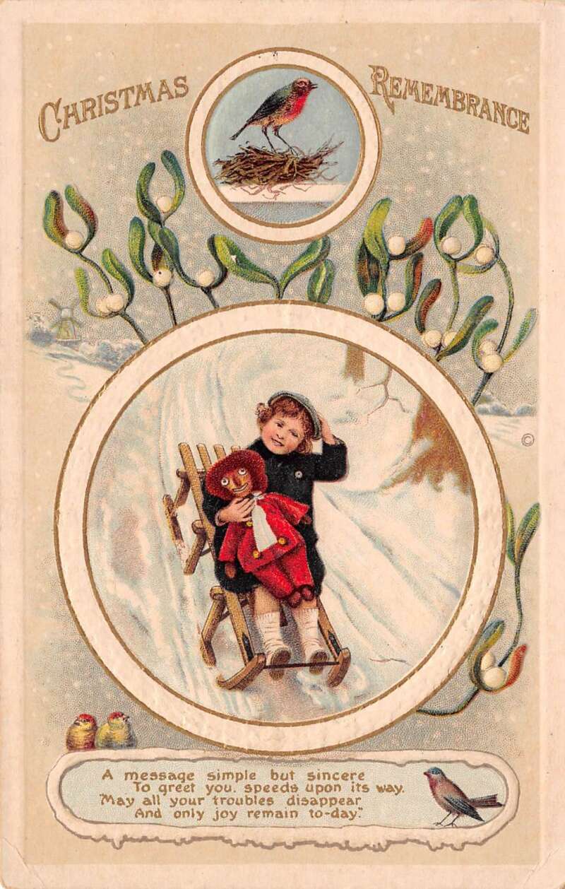 Christmas Remembrance Child & Doll Sledding in Snow, Vintage Postcard U16135