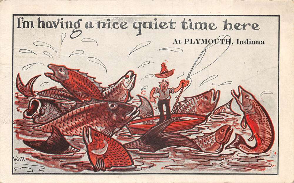 Plymouth Indiana Fishing Exaggeration Greetings Humor Postcard AA107954