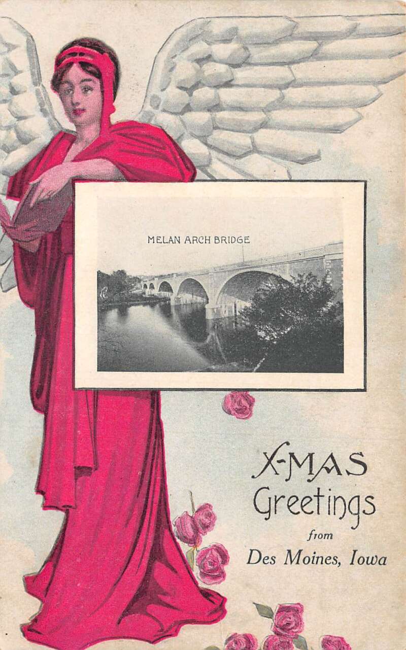 Des Moines Iowa Christmas Greetings Angel Melan Arch Bridge Postcard AA107971