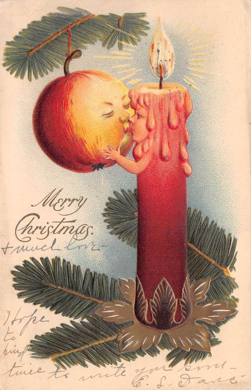 Christmas Greetings Fantasy Candle Kissing Apple Vintage Postcard AA78152