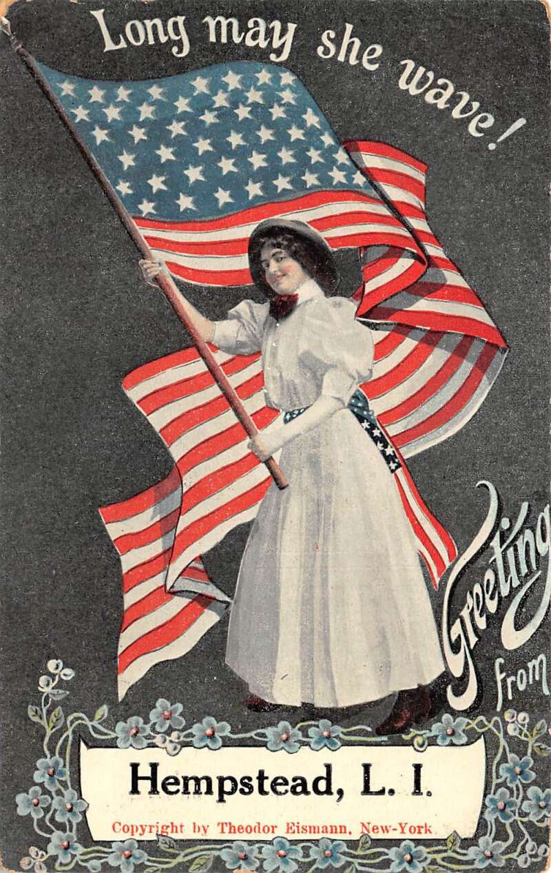 Hempstead Long Island New York Patriotic Greetings Lady with Flag PC AA78165