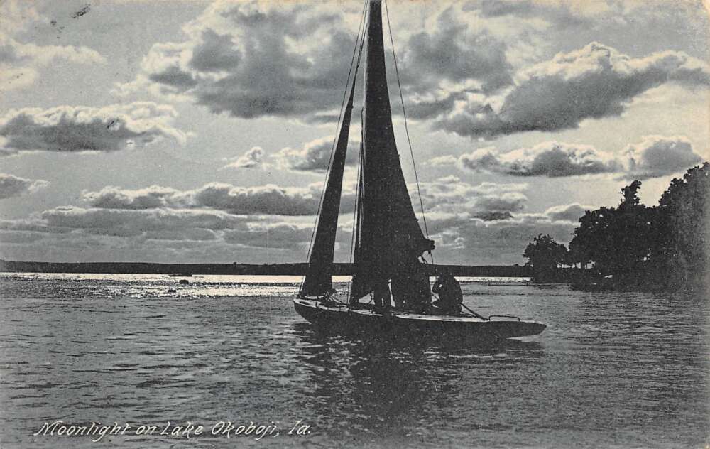 Okoboji Iowa Moonlight on Lake Sailing Vintage Postcard AA73262