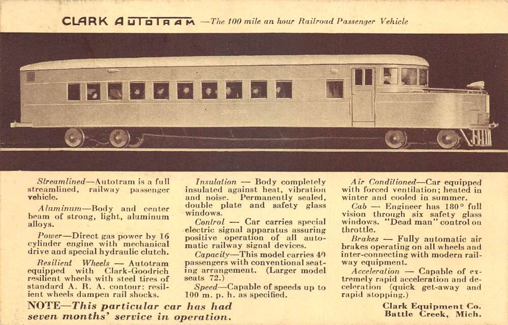 Battle Creek Michigan Clark Autotram Railroad Passenger Vehicle PC AA1100916
