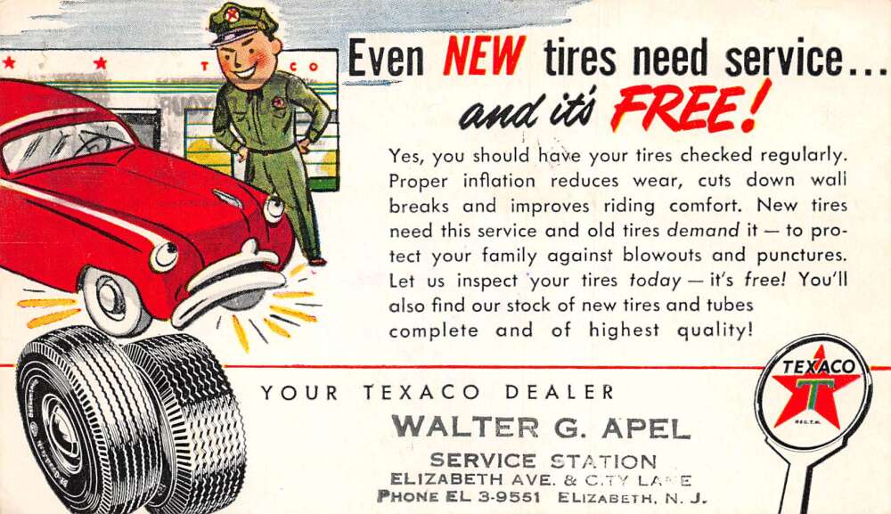 Elizabeth New Jersey Apel Texaco Service Station Tire Ad Postcard AA109230