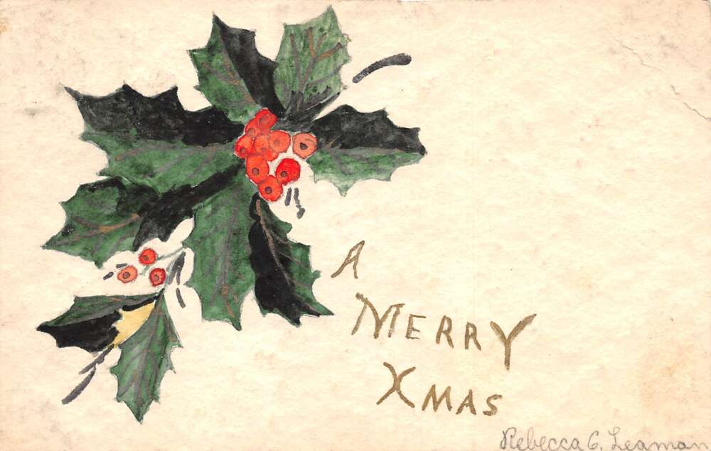 Christmas Greetings Holly Leaves Hand Made Painted Vintage Postcard AA73840