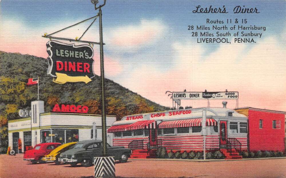 Liverpool Pennsylvania Lesher’s Diner Linen Vintage Postcard AA72454