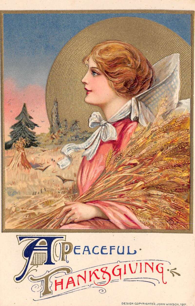 Thanksgiving Greetings Woman gathering Wheat Farming Scene Winsch PC AA72464