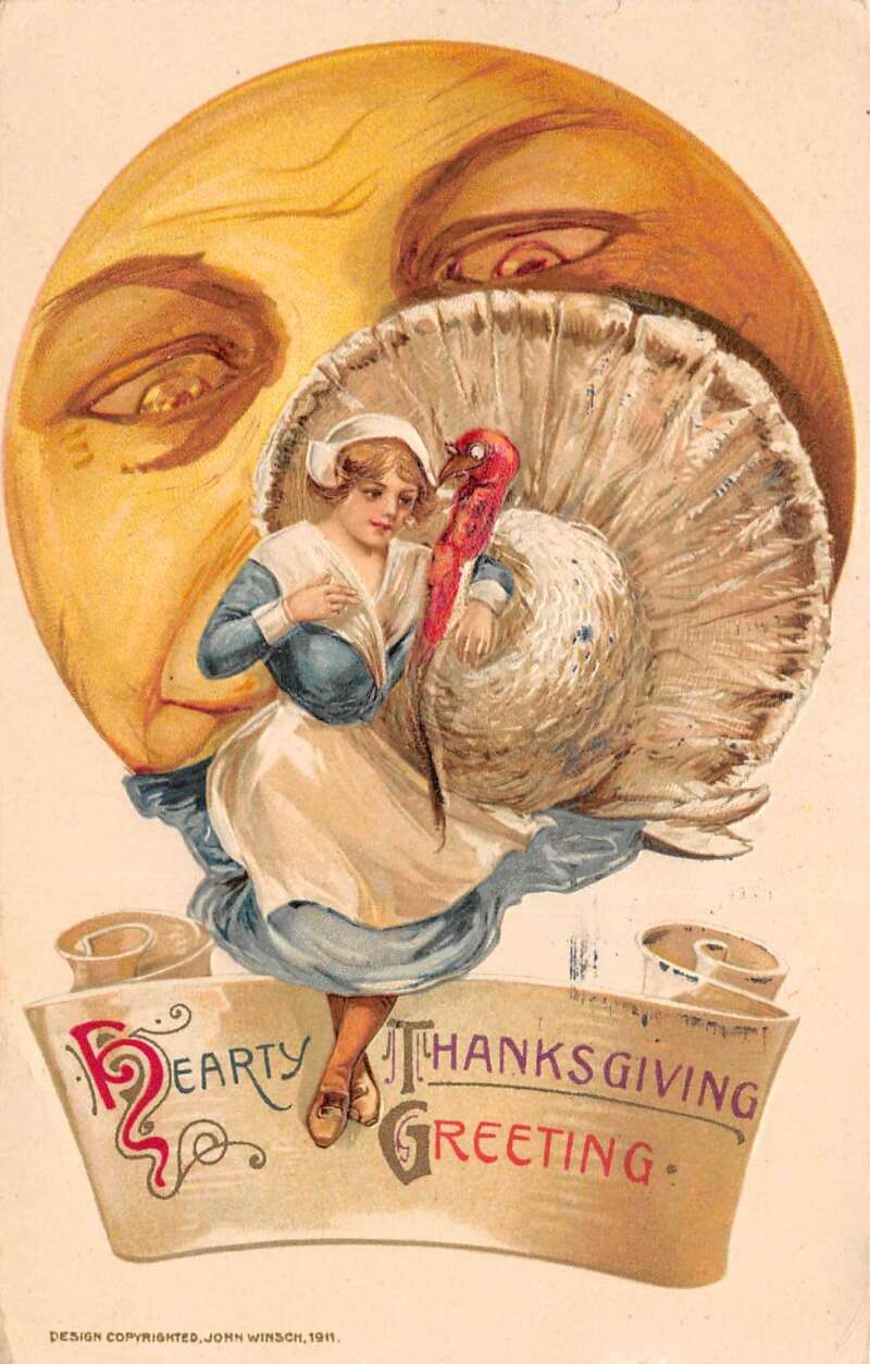 Thanksgiving Greetings Woman with Turkey and Moon Face Winsch Postcard AA72465