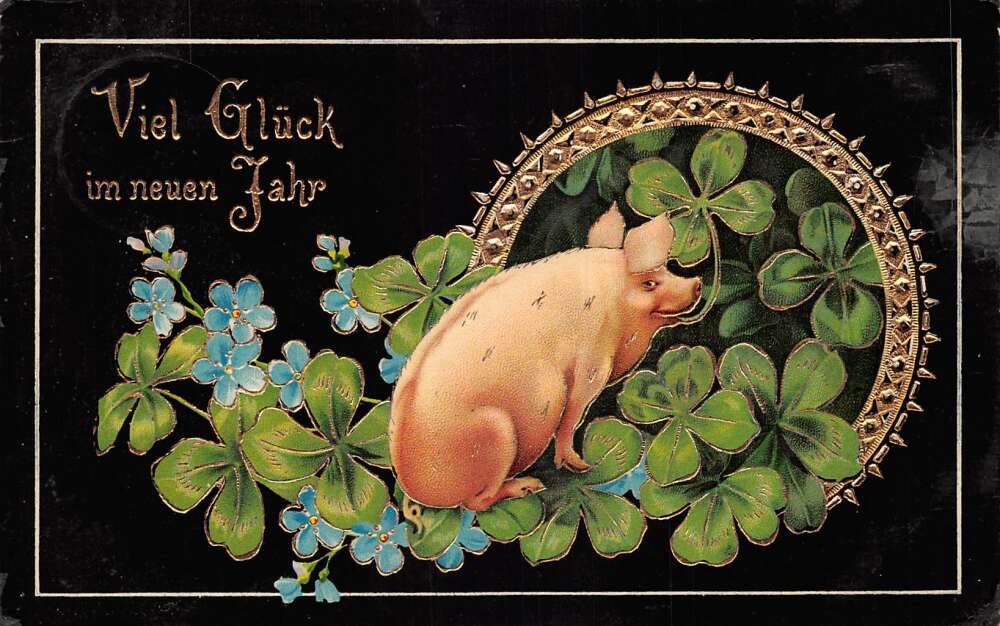German New Year Greetings Pig with Clovers Vintage Postcard AA73811