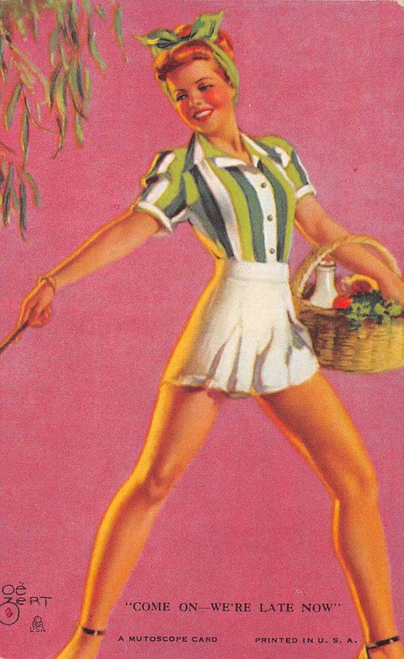 Pin Up Girl with Basket of Food “We’re Late” Zoe Mozert Arcade Card AA73817