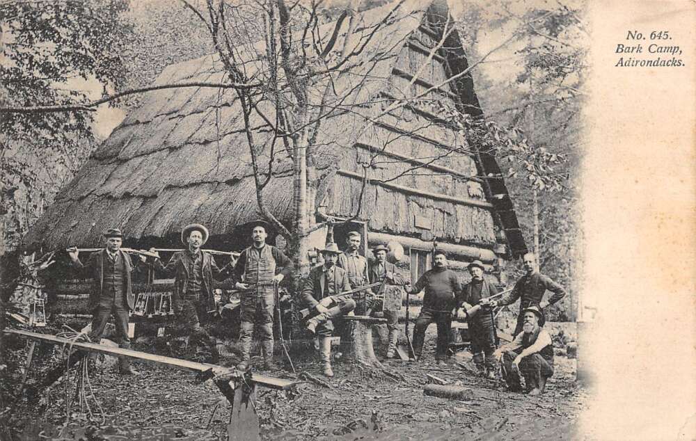 Adirondacks New York Bark Camp Hunters Vintage Postcard AA110062
