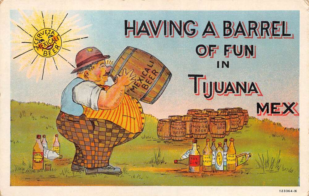 Tijuana Mexico Greetings “Barrel of Fun” Drinking Beer Postcard AA111730