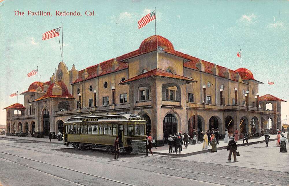 Redondo California The Pavilion, Trolley, Color Lithograph, Vintage PC U27033