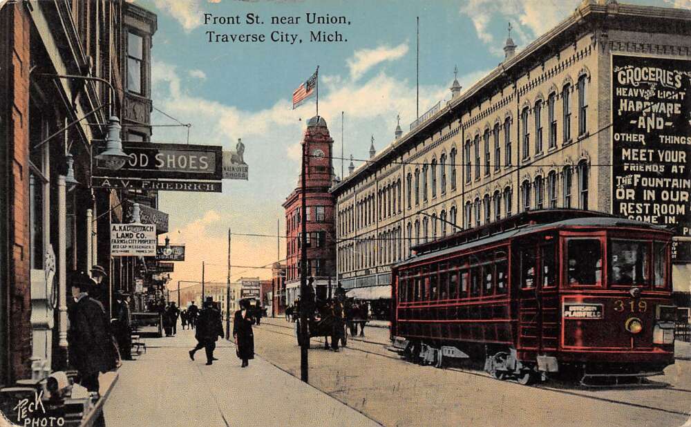 Traverse City Michigan Front St. Near Union, Trolley, Vintage Postcard U27038