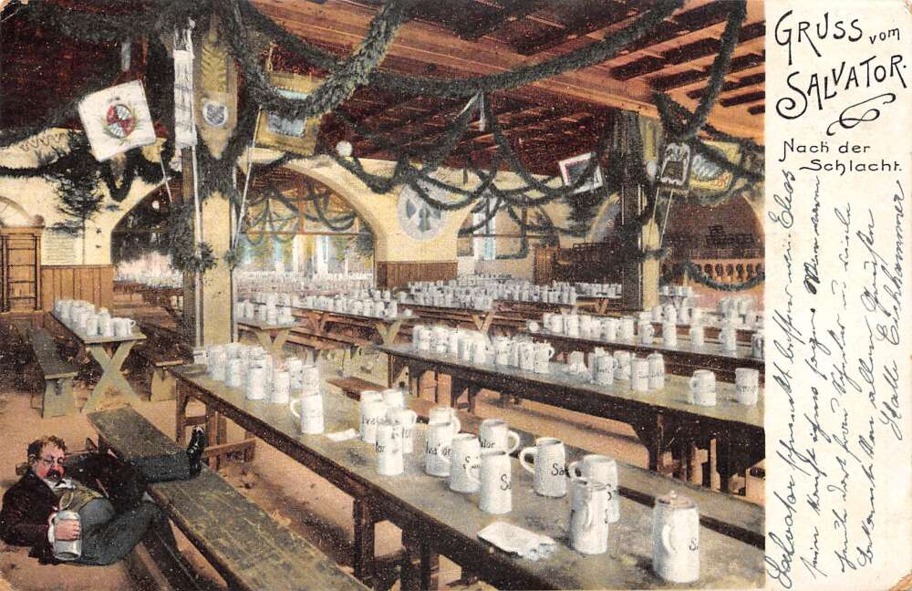 Salvator Beer Ad Germany Pub Bar Interior Drunk Man Gruss vom Postcard AA85974