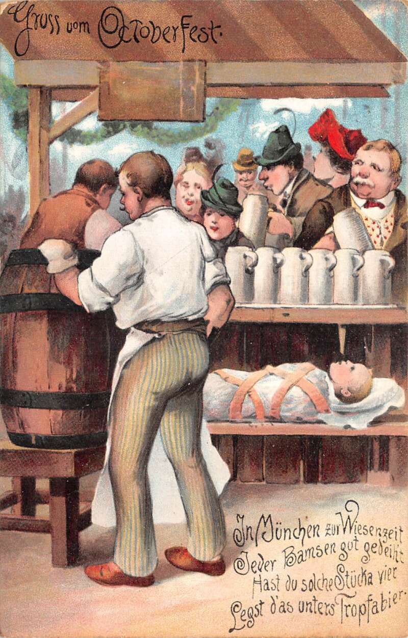 Germany Octoberfest Greetings Pub Scene Baby Under Bar Vintage Postcard AA85976