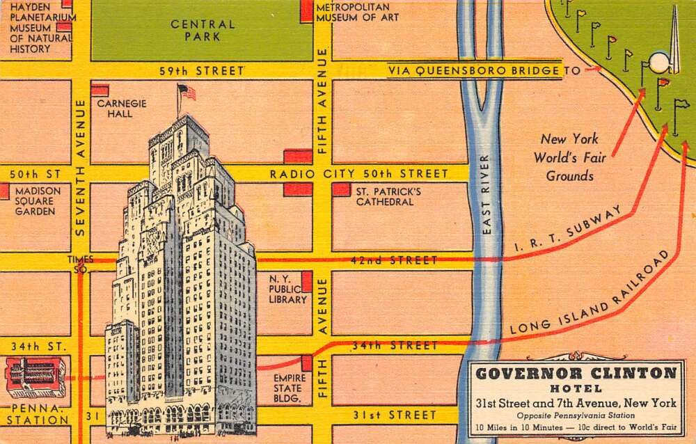 New York City Hotel Governor Clinton and Street Map Vintage Postcard AA85880