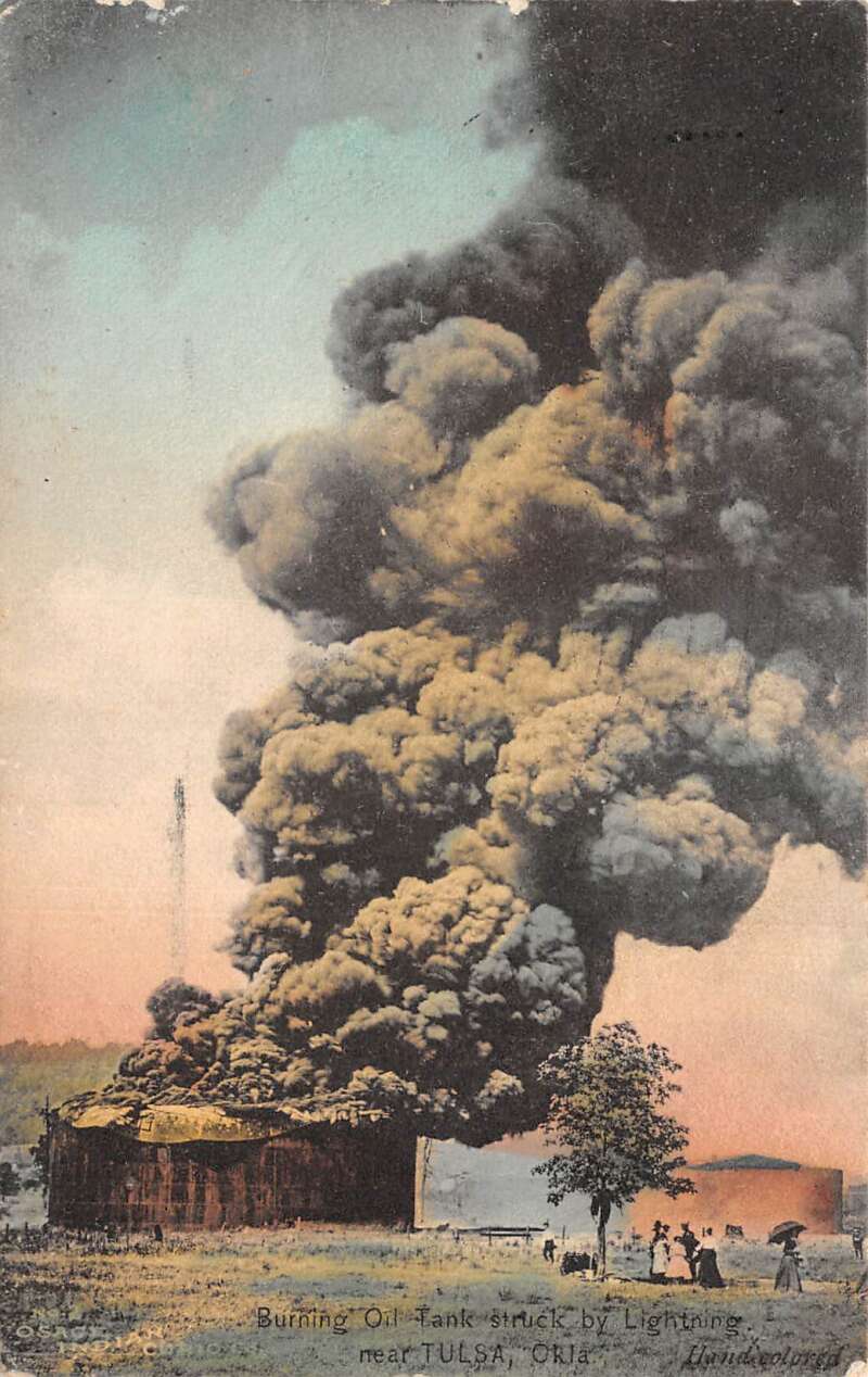 Tulsa Oklahoma Burning Oil Tank Struck by Lighting Fire Postcard AA106060