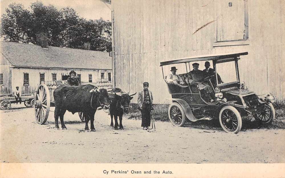 Townsend Masssachusetts Cyperkins’ Oxen and The Auto Antique Postcard J63480