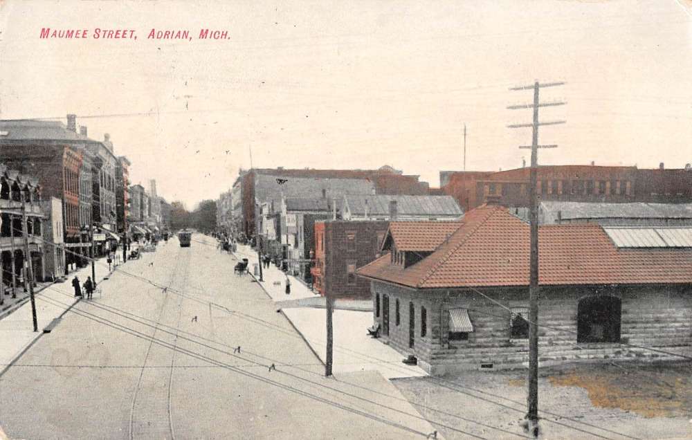 Adrian Michigan birds eye view Maumee St trolley train antique pc Y12347