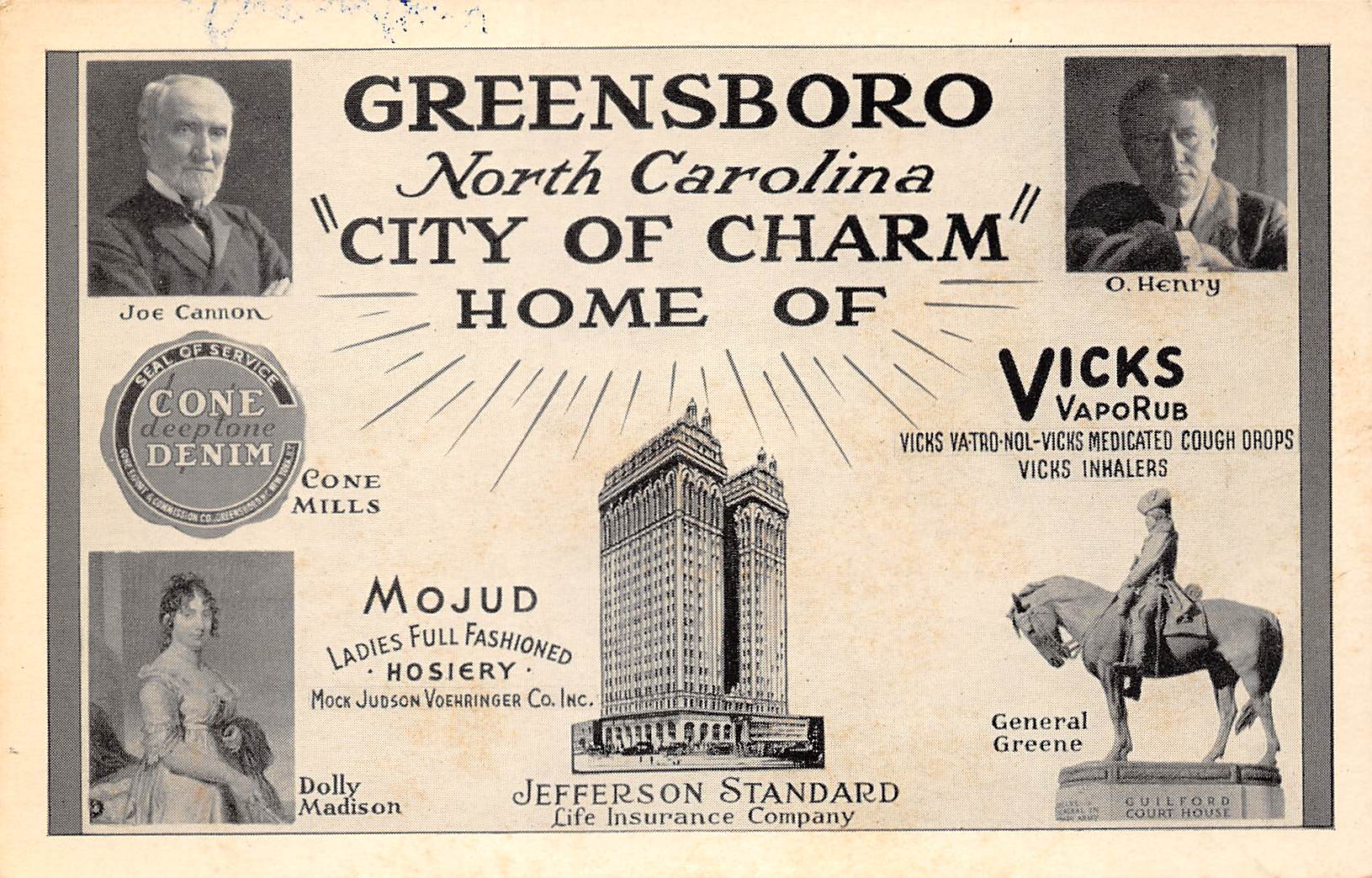 Greensboro North Carolina Home Of Cone Mills, Vicks VapoRub,Mock Judson Voehringer Co., & Jefferson Standard Life Insura